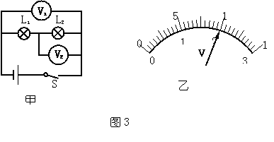 12. 小明按如图3甲所示将两只相同的灯泡L1、L2接入电路,当开关闭合后,电压表V1和V2的指针位置完全一样,如图3乙所示,则