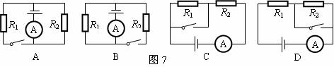 14.图7所示四个电路的电源电压相等且不变,电阻R1的阻值大于R2的阻值。开关断开时与开关闭合时相比,电流表示数的变化量最大的电路是