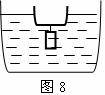 15.水槽中放一个小铁盒,铁盒中放少许细线和一个铝块,铁盒漂浮在水面。现用细线把铝块拴在铁盒下面,铁盒仍漂浮在水面,如图8所示。讨论此时水槽中的水位以及铁盒浸入水中的体积,说法正确的是