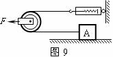 如图9所示,用力F拉着滑轮,使重200N的物体A以0.2m/s的速度,在水平地面上匀速运动。弹簧测力计的示数为5N。不计轮重、弹簧测力计重、绳重和轴摩擦,则下列叙述正确的是