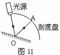 在一些实验或精密仪表中,常常利用平面镜对光的作用来放大微小转动。图11所示就是这类装置的原理图,初始时刻,从光源发出的光线照射到平面镜中心O点,被平面镜反射到刻度盘上的A点,当平面镜以O点为轴顺时针转过一个角度a时,被平面镜反射的光线转过的角度为________。