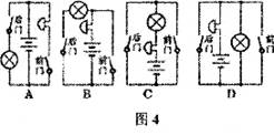 6、学校传达室用一只灯泡,一个电池组,一个电铃,两个开关及若干导线组成一个电路。要求前门来人闭合开关,电铃响而灯不亮:后门来人闭合开关,电铃响,灯也亮,那么如图4所示电路中连接正确的是