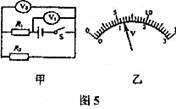 7、如图5所示,当甲电路中的开关S闭合时,两个电压表的指针位置均为如图乙所示,则电阻R1和R2两端的电压分别为
