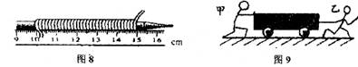 11、某同学用如图8所示的方法测精细钢丝的直径:将细钢丝的铅笔上紧密排绕32圈后用刻皮尺测量,测得这个线圈的长度是 cm,细铜丝的直径是 mm。