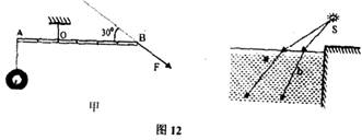 N,画出铁球重力G的图示和力F的力臂L;(2)如图12乙所示,a、b为岸上灯泡S发出的光线,都能射入潜水员的眼睛中,请作图找出潜水员看到岸上灯泡的位置S′。