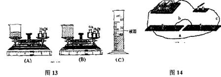 16.如图13所示(A)、(B)、(C)是某同学测定某种液体密体的实验情况中,最为主要的三个实验步骤。