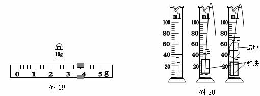 用调好的天平测量蜡块的质量,天平平衡时,右盘中的砝码及游码在标尺上的位置如图19所示,蜡块的质量是________g;测量蜡块体积的过程如图20所示,蜡块的体积是______cm3;计算得到蜡的密度是________________kg/m3.查表可知蜡的密度是0.9g/cm3,测量值与其存在差异.