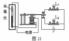 38.图21所示为一种温度自动报警器的原理图.在水银温度计里封入一段金属丝.当温度达到金属丝下端所指示的温度时,就可以发出报警信号.这种温度自动报警器既可以进行高温报警(即温度达到或超过设定的温度时报警),也可以进行低温报警(即温度低于设定的温度时报警).请你根据上面的介绍,并结合图21分析回答下面的问题.