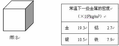 21. 一正方体金属块,其质量为21.6g,实物与图8等大。组成该金属块的物质是 。