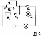 24.如图9电路中,电源两端电压保持不变,a,b是滑动变阻器的两个端点,R2=20Ω,灯L标有“9V 8.1w”字样。