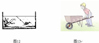 (4) 工地上建筑工人常用如图13所示的小车运送建材,画出小车所受重力的示意图及其对支点O的力臂。