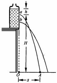 (2)经过反复的试验,小明发现从小孔中射出水流的射程s (从小孔处到落地点的水平距离OA)跟小孔在水中的深度h和小孔到地面的高度H这两个因素有关。为了研究水流的射程s与h、H之间的关系,他将饮料瓶放置在水平桌面边缘,看到如图18所示的现象,由此他得出了结论:小孔距水面的深度h越大,水流的射程s越大。