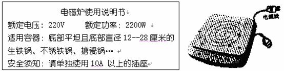 34.如图20是某品牌的电磁炉及说明书。在1标准大气压下,小明用该电磁炉将一壶2.2kg的水从20℃ 烧至沸腾,需要多长时间?[ 假定电磁炉消耗的电能全部转化为热能被水吸收。水的比热C水 = 4.2×103J/(kg.℃ )]