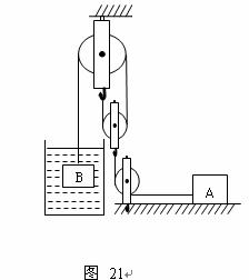 35.如图21所示,重为100N的物体B,在足够深的水中匀速下沉,通过滑轮组拉着重600N的物体A沿水平方向匀速运动,在4s内物体A移动了0.8m,,已知ρB=5ρ水,动滑轮重12N,不计绳重及摩擦。(取g=10N/kg )
