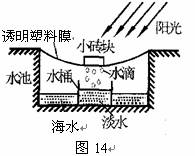 30.小明参加位于偏远海岛的夏令营,由于缺乏生存所需的淡水,师生试图设计一种简便的用海水获取淡水的装置。在地面上挖一水池,往池内灌海水,按图14所示完成设备的安装,即可收集淡水。请你将下列设计中的空白处填写适当的内容。