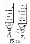 31.一位物理实验小组的同学利用一只可乐瓶与一只乒乓球做“研究浮力产生原因”的实验,如图15所示,将一只塑料可乐瓶剪去底部,把一只乒乓球放在瓶内,从上面倒入水,观察到有少量水从乒乓球与瓶颈缝隙中流出,如图15甲所示,但乒乓球并不上浮,这说明了_____________________。若用手堵住瓶口如图15乙所示,可观察到乒乓球浮起,这说明了______________________。(2分)