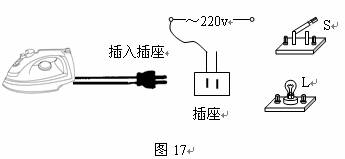 33. 如图17所示,某裁缝店的电熨斗连接着一个白炽灯L(灯泡的电阻较大),闭合开关S,电熨斗处于高温熨烫状态,灯L不发光;断开开关S,电熨斗保持低温时,灯L发光。请用笔画线代替导线把该电路连接完整。(2分)