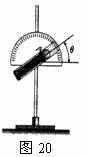 为了检验上述猜想是否正确,他们制作了一个小球弹射器,如图20所示。它能使小球以不同的速度大小和方向射出,弹射方向与水平方向的仰角,可由固定在铁架台上的量角器读出。他们通过7次实验得到下表中的实验数据(“射出距离”指水平距离).