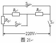 39.物理小组自制一个可以改变电功率的电热器。他们用三根阻值不相等的电阻丝R1、R2和R3按图21连接起来,接入220V电源。已知R1<R2<R3,闭合电源开关S,通过S1和S2的开关控制,可以得到四种不同的电功率,知道最大的电功率是最小电功率的11倍,只闭合S1时流过电路的电流是2.2A,此时电功率是只闭合S2时电功率的2倍。求三根电阻丝的阻值。(5分)