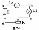 13.在图7所示的电路中,电源电压恒为6伏特,当合上电键后,发现两个灯泡(均标有3V 1W)都不亮;用电压表测得Ubc=Ubd=6 V,如果各段导线及接线处均无问题,这说明