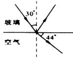 19、下图为光从玻璃斜射人空气的光路图,由图可知,反射角是 度,折射角是 度。