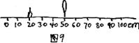 4、在探究“凸透镜成像规律”的实验中,所用凸透镜的焦距是l0cm。用米尺在水平桌面上画一直线并标明刻度,将透镜固定在50cm处,如图9所示。