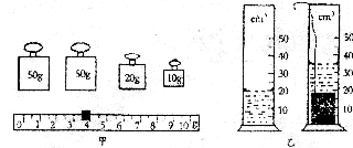 34.用天平和量筒测定金属块的密度,图甲所示的是用天平称金属块质量,天平平衡时,右盘所放砝码及标尺上游码的位置。图乙所示的是用量筒测金属块体积,放入金属块前、后液面的位置。请从图中读出有关实验数据,并将这些数据及计算结果填入下面的表格中。