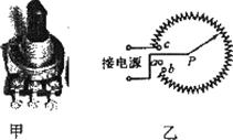 14、如图甲所示是一种简易调光台灯的调节亮度旋钮兼开关的调节器,图乙为其说明书中的内部结构示意图。若要使台灯的灯光最暗,滑片 P应该移至________点(选填“a”、“b”或“c”)。分析结构图可知,调节器调节台灯亮度变化的原理________________。