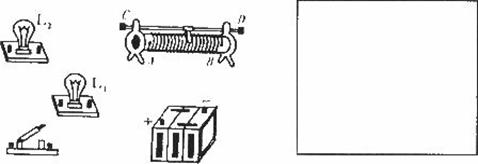 17、下左图给出了几种元件,要求:灯L1和L2互不影响,开关同时控制两灯,且能用滑动变阻器控制L2的亮度,请你根据要求在方框内画出电路图,并在图上用笔画线代替导线把电路元件连接起来。