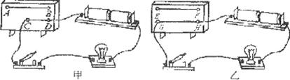 20、如图所示,甲图中AB和CD是长度不等、粗细相同的镍铬合金线,分别将它们接入电路,闭合开关后,发现接入导线AB时,灯泡发光较暗,这说明导体电阻跟________________有关。乙图中EF和GH是长度相等、粗细不同的镍铬合金线,已知EF的横截面积较大,同样将它们分别接入电路后,发现接入GH时灯泡发光较暗,由此可以得出的结论是________________________________________________________________。