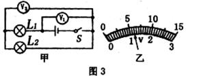 10.在如图3所示的电路中,当开关S闭合后,两个电压表指针偏转均为图3乙所示,则电灯L1和L2两端的电压分别为