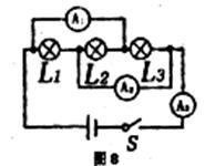 17.如图8所示的电路,闭合开关S,通过灯L1、L2、L3的电流分别是3A、4A、5A,则电流表A1、A2、A3的示数分别为__________,__________,__________。