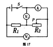 28.图17所示的电路中,电源电压恒定为4.5V,闭合开关S后,电流表示数为0.5A,电压表V1的示数为3V。当把滑动变阻器的滑片移到最右端时,电流表示数变为0.3A。求: