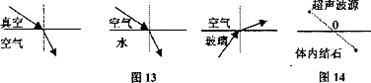 (5)现代医学中常用超声波击碎人体内的结石,超声波从空气中斜射入人体后也类似光一样要发生折射,如图14所示,超声波进入人体击碎结石时,入射点应在0点的 (填“左侧”或“右侧”)