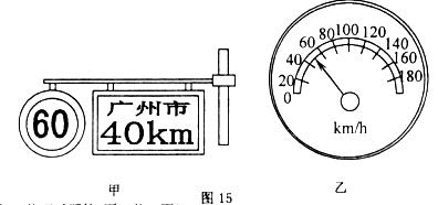 33.小红随爸爸、妈妈旅游回来,在广佛公路的一个十字路口,看到如图15甲所示的标志牌。小红看到汽车上的“迈表”--速度计的示数如图l5乙所示。如果汽车保持这个速度还要多少时间才能到达市区?