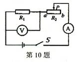 10.如图所示的电路中,电源两端电压为6V并保持不变,定值电阻R1的阻值为100Ω,滑动变阻器R2的最大阻值为50Ω.当开关S闭合,滑动变阻器的滑片P由b端移到a端的过程中,下列说法中正确的是[ ]