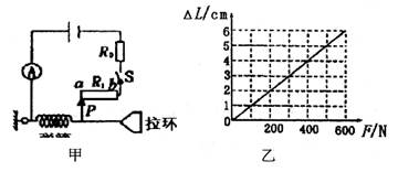 (3)已知该弹簧伸长的长度△L与所受拉力F间的关系如图乙所示.通过计算说明,开关S闭合后,当电流表指针指在0.3A处时,作用在拉环上水平向右的拉』力是多大?