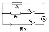 26.在学习欧姆定律之后,老师请同学们设计一个测未知电阻R2的电路。李刚和同组同学设计的电路如图9所示。电阻R1的阻值是20Ω,当S1闭合、S2断开时,电流表的示数是0.3A;当S1、S2都闭合时,电流表示数是0.5A。求: