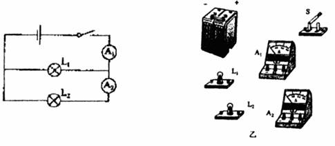 21、在下图(左)中,闭合开关后,通过灯泡L1的电流为0.5A,通过灯泡L2的电流为0.3A。试根据左图将图乙中的实物用铅笔线表示导线连接起来。