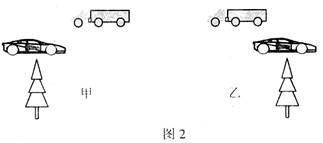 15.如图2是小明同学在不同时刻对公路上的卡车和轿车所拍摄的两幅照片,由此照片可判断得出以下结论:以_________为参照物,轿车是静止的;以_________为参照物,轿车是向右运动的(空中填“卡车”或“轿车”或“树”)。