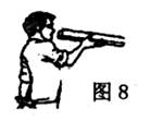 19.如图8所示,为了检查一块木板的棱是否直,可以闭住一只眼睛,用另一只眼睛沿着棱的长度方向看去,这是利用了____________________的原理。请你举出一个相类似的应用例子:__________________________________________________。