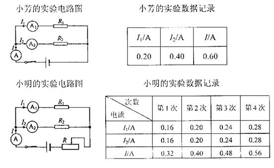 20.小芳和小明分别设计了探究“并联电路电流规律”的实验,他们各自设计的实验电路图及实验数据记录如下所示.(小芳和小明实验时电路连接及记录的数据都没有错误.)