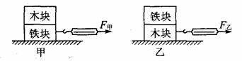 25.(3分)小军用弹簧测力计来探究“木块和铁块的下表面哪个更粗糙”,他在同一水平桌面上进行了如图甲、乙所示的实验:叠放的物块在水平拉力作用下均作匀速直线运动,在甲实验中,测得拉力 F 甲=3N ;在乙实验中,测得拉力 F 乙=3 . 5N。