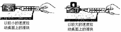 器材:a、小车 b、带钩的正方体木块 c、带钩的长方体木块 d、表面平整的长木板 e、几条毛巾 f、直尺 g、弹簧测力计 h、硬纸板