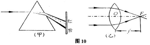 20、如图l0所示,冬冬在探究光的色散现象时,看到白光经三棱镜后,光屏上自上而下出现了红、橙、黄、绿、蓝、靛、紫的色带,冬冬对产生的原因进行了思考。受此启发,在测量凸透镜的焦距时,冬冬想:如果分别用红光和紫光平行于同一个凸透镜的主光轴射人,红光、紫光对凸透镜的焦距是否不同呢?