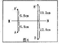 4、在“研究平面镜成像特点”时,某同学利用一块玻璃板代替平面镜实验,其记录如图6所示,其中心是玻璃板的位置,A、B是两次实验蜡烛的位置,A’B’是像的位置。