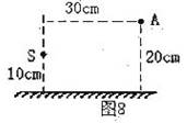 1、如图8所示,光源S发出一条光线经平面镜反射后通过A点,S、A距平面镜分别为 10cm和20cm,它们之间的水平距离为30cm。