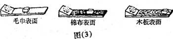 13.如图(3)所示,给水平桌面铺上粗糙程度不同的物体(如毛巾、棉布等)。小车自斜面顶端从同一高度静止开始下滑,观察小车从同一高度滑下后,在不同表面运动的距离,测得如表所示结果:
