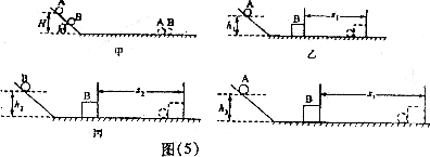 15.马骏同学为了探究动能的大小与什么因素有关系,他做了如图(5)所示中的甲、乙、丙、丁实验。他首先让两个金属球A,B处在同一斜面的不同高度处,当球滚到平面上时,无论哪个的质量大,总是处在高位置的金属球能追上低位置的金属球,如实验甲。接着他又用质量不同或高度不同的金属球滚下后,推动水平面上的木块,使木块在水平面上移动一段距离。他实验的数据如表所示。实验表明: