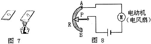 20.如图8所示是一个简易的风扇调速器电路图,R是圆形电阻片,P是滑片,请回答下列问题: